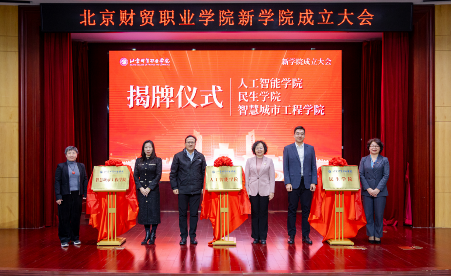 3月18日,北京财贸职业学院在校本部举行人工智能学院、民生学院成立和智慧城市工程学院更名揭牌仪式。